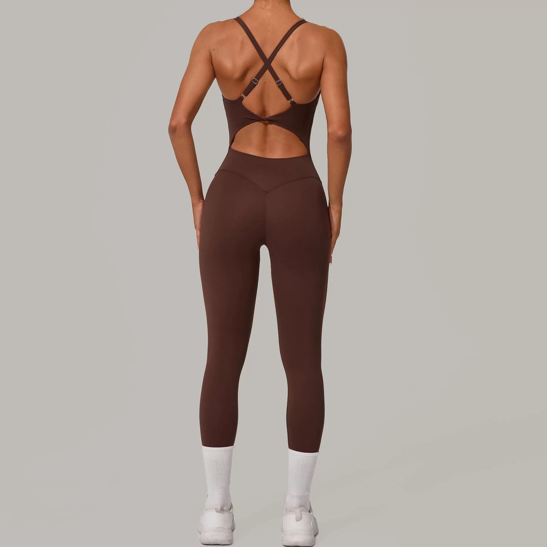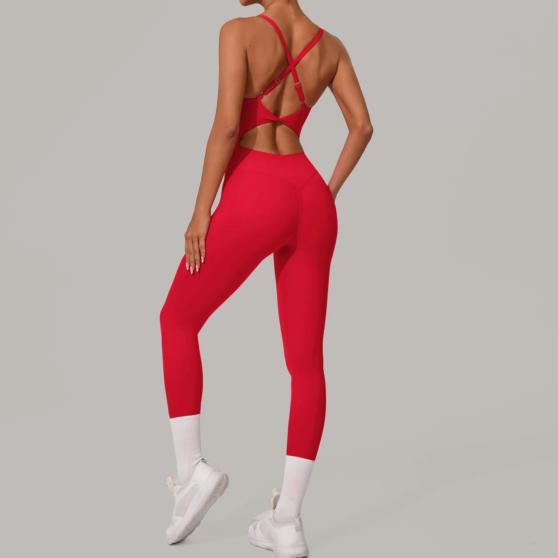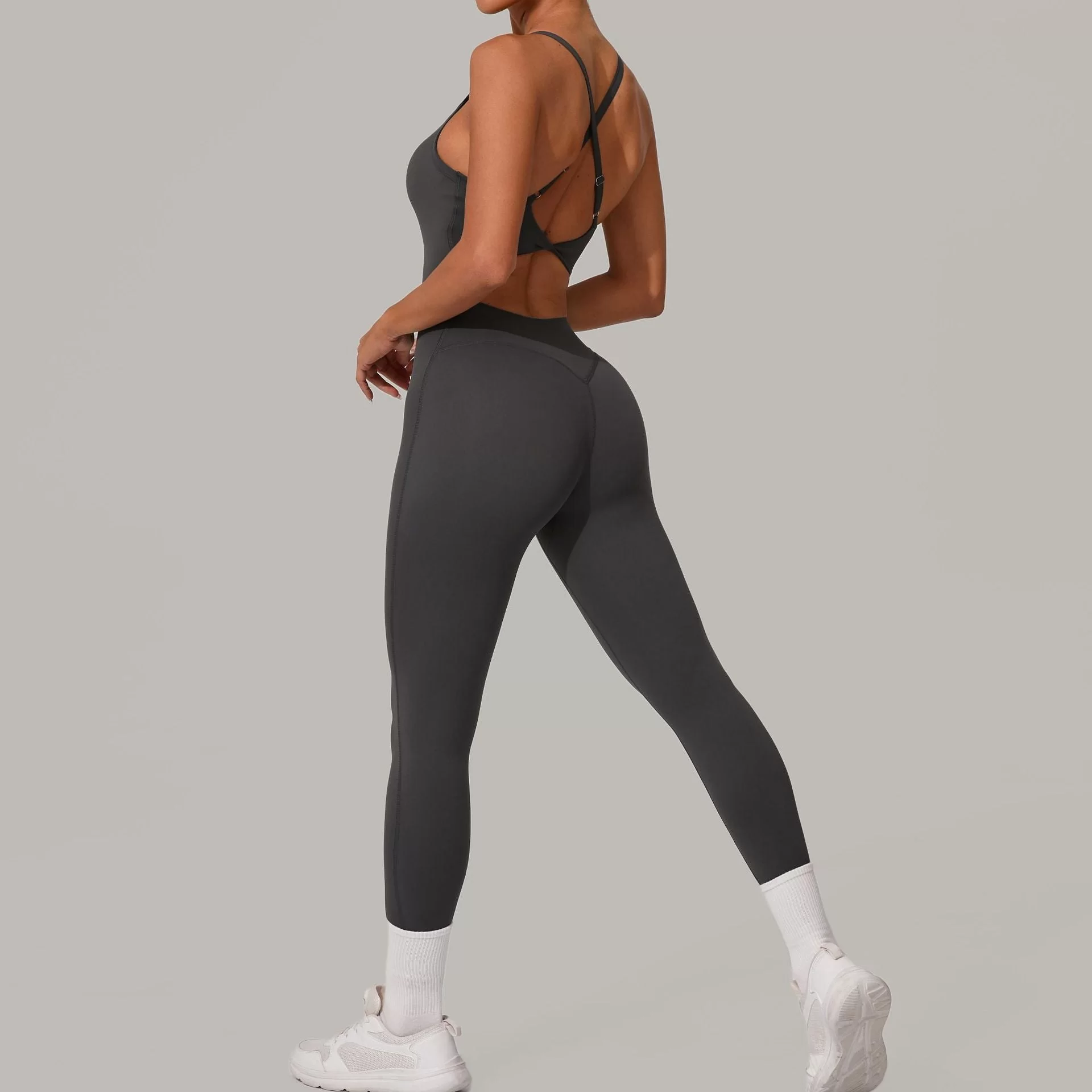 This wholesale adjustable yoga jumpsuit is designed for women seeking a sculpting fit with flexible comfort. Featuring a heart-shaped neckline (V-style) with adjustable buckle straps, it allows a customized fit while enhancing the upper body silhouette. The cross-waist design shapes the waistline, while the lifting cut helps accentuate the hips for a flattering, body-contouring look.