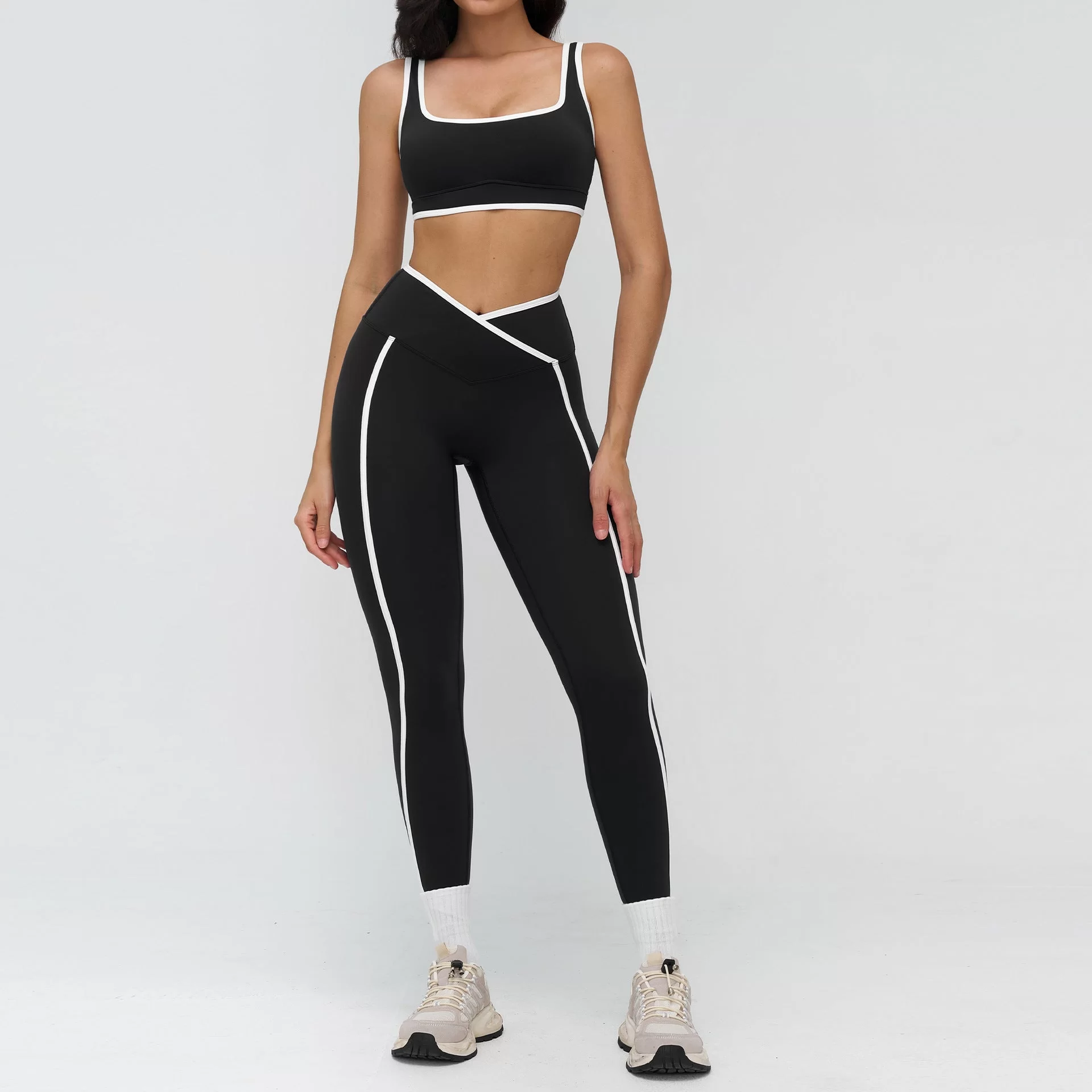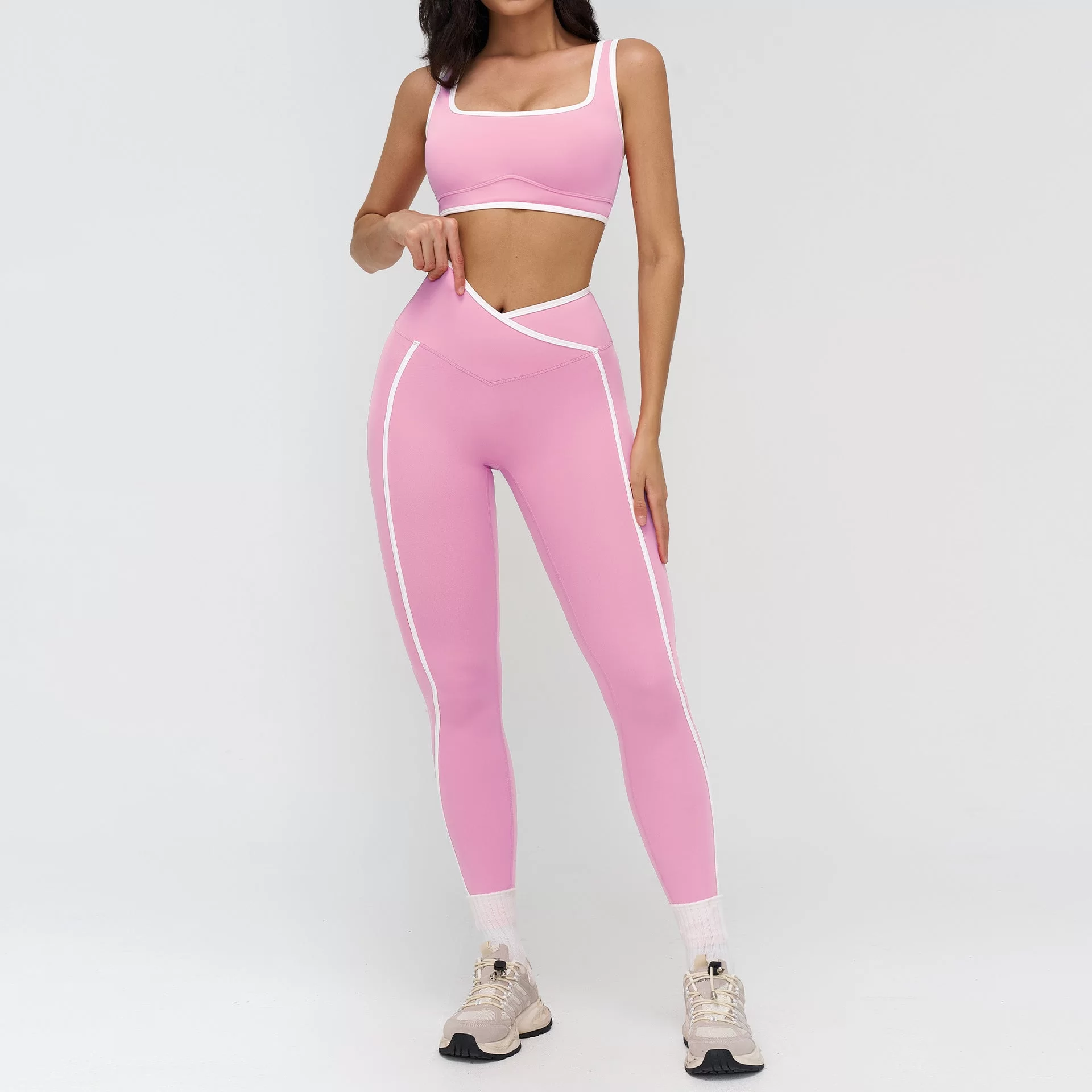 This wholesale bare feel yoga set is designed for women??s cross-border activewear markets, blending a sleek, tight-fit silhouette with modern contrast styling. Crafted from premium bare-feel fabric, it delivers a smooth, second-skin wearing experience with excellent stretch and breathability. The contrast color design adds a fashionable, sporty edge while maintaining a clean, athletic look.