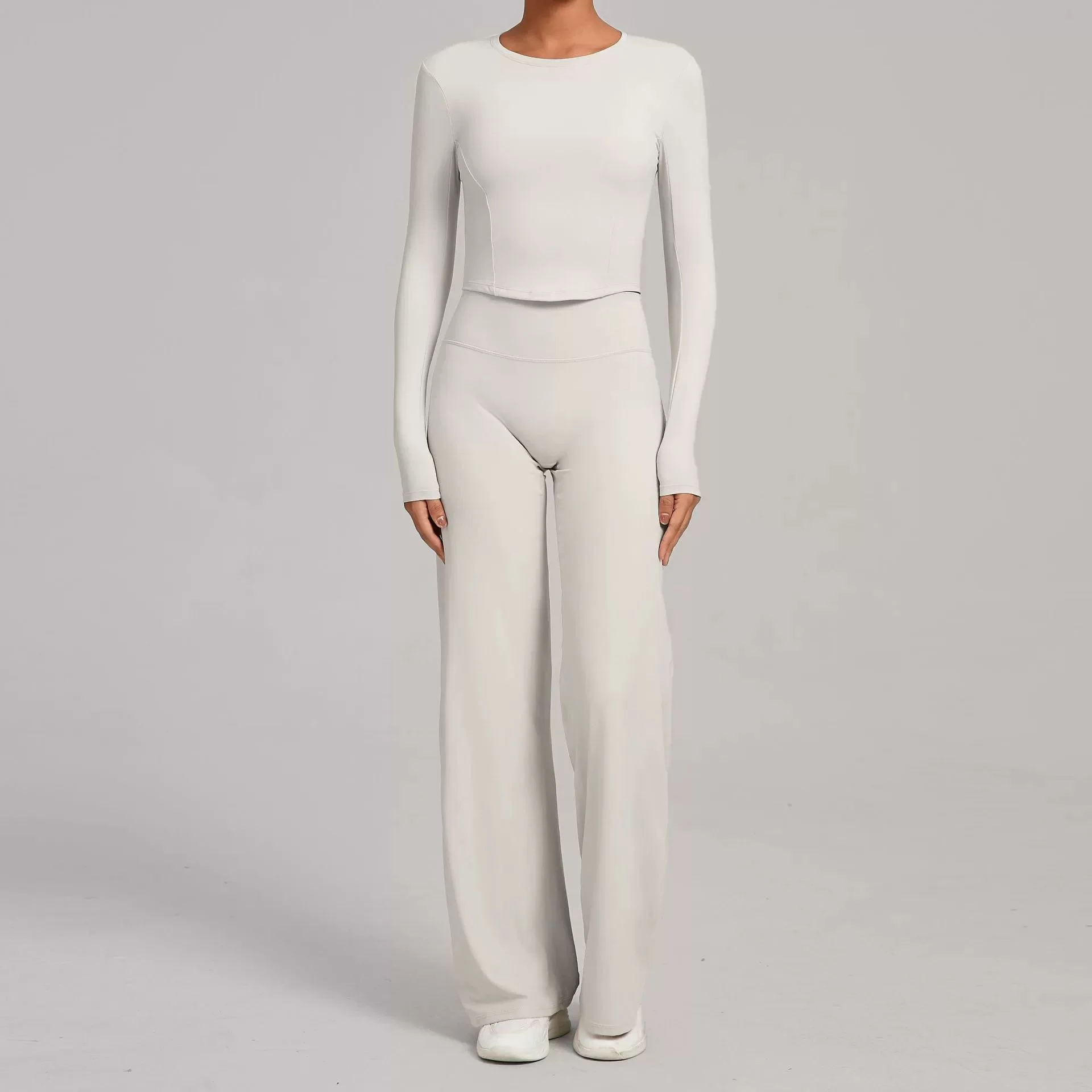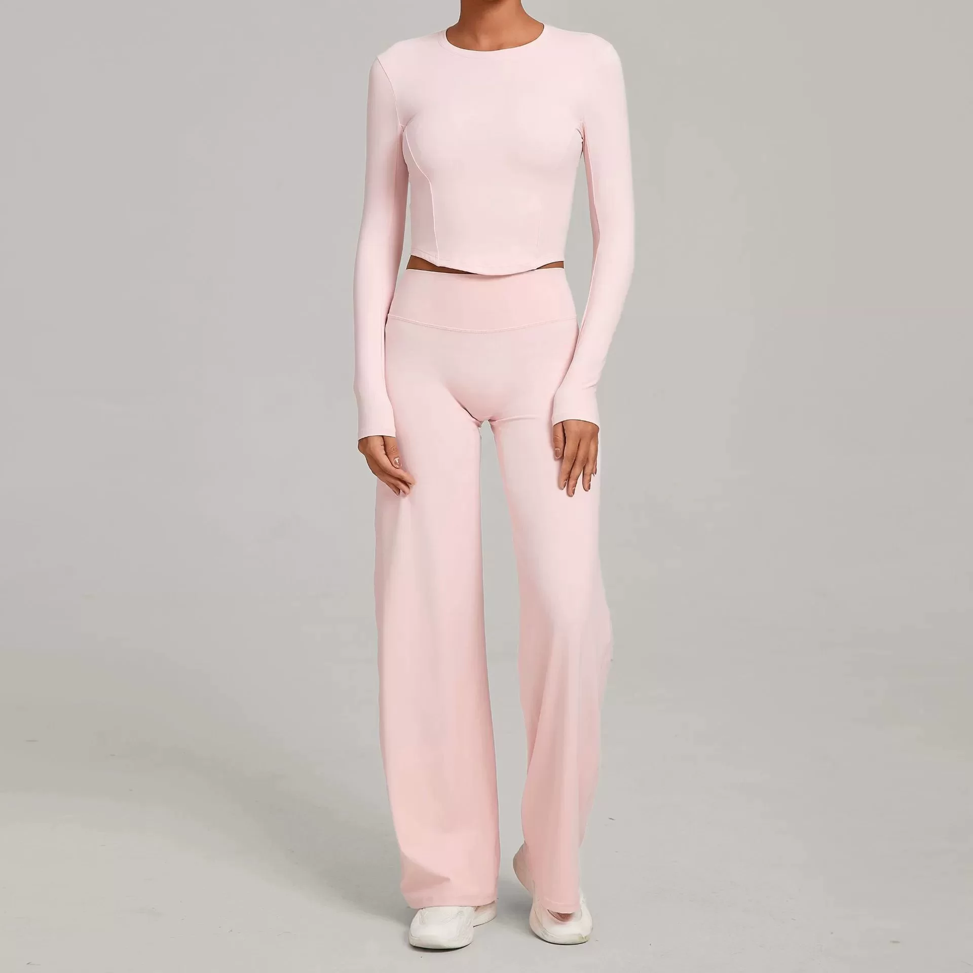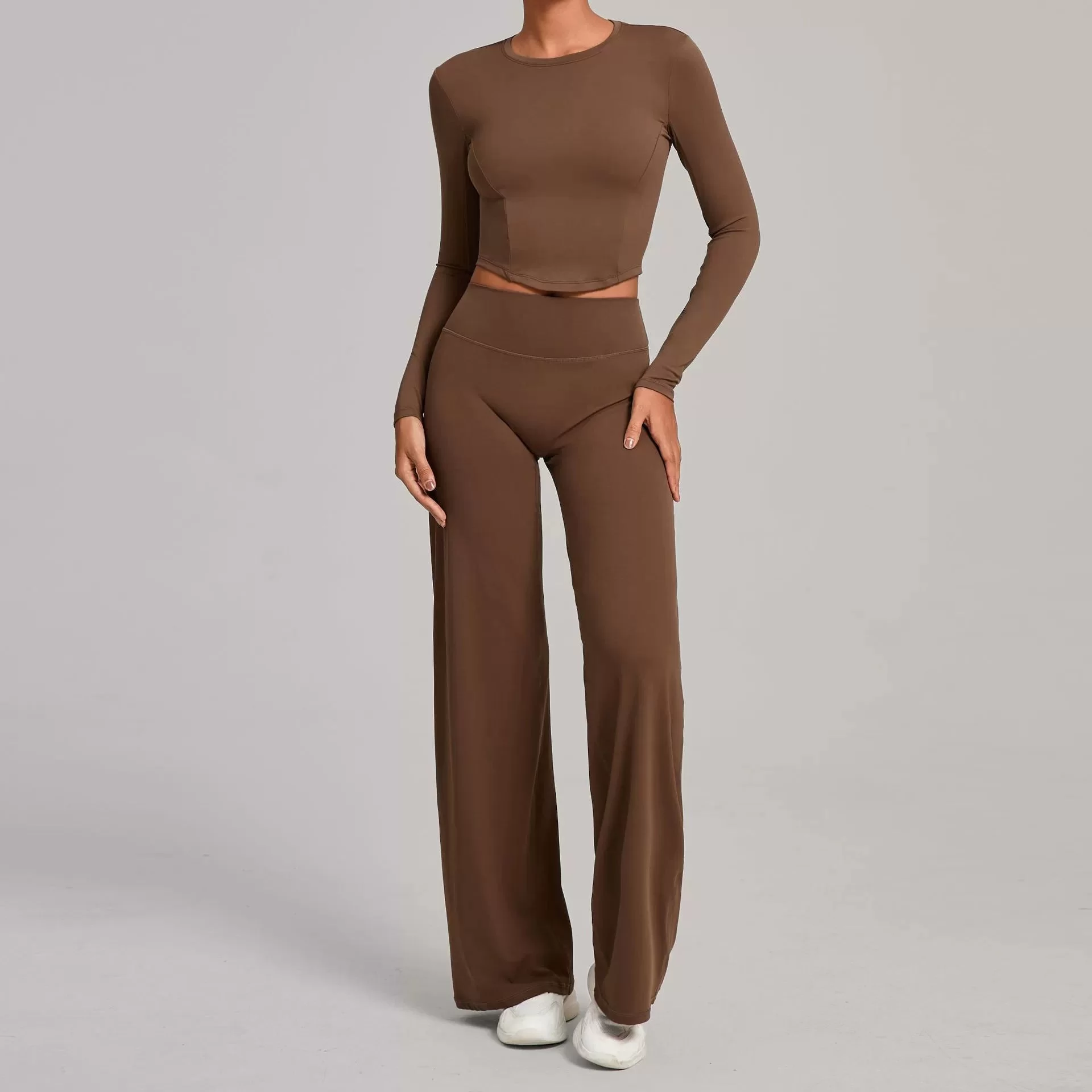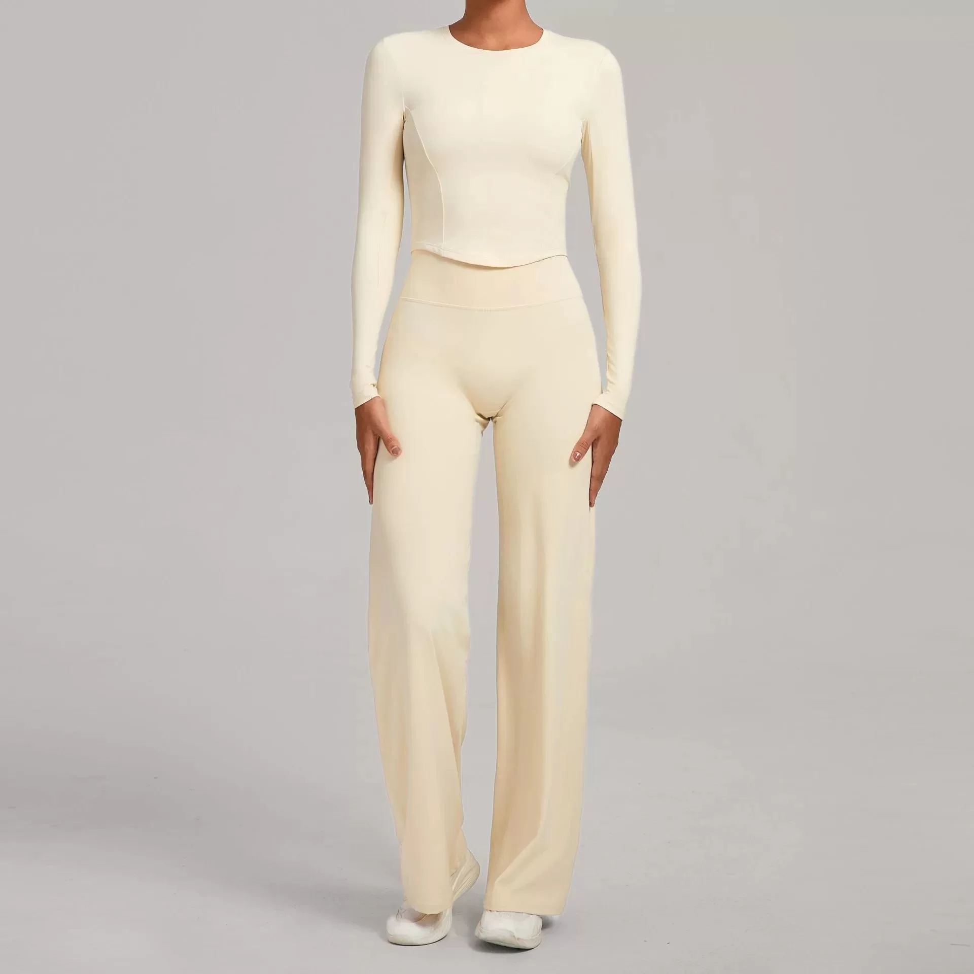 This wholesale bare feel yoga set is designed for autumn and winter women??s activewear collections, combining minimalist style with high-performance comfort. Featuring a sleek, tight-fit silhouette and a soft bare-feel fabric, this two-piece set delivers a smooth, second-skin wearing experience that enhances natural body lines.