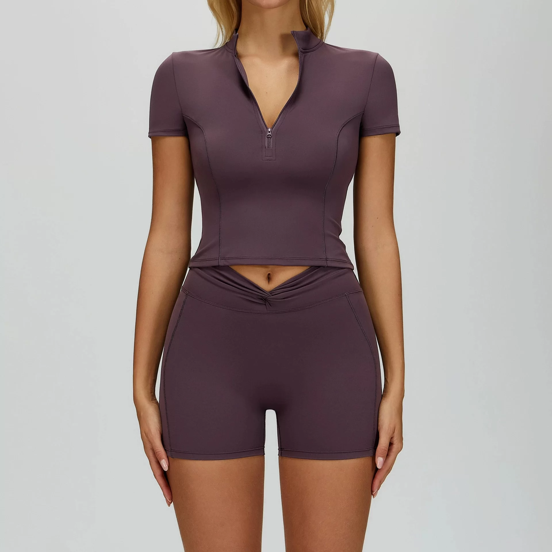 This wholesale bare feel yoga set features a sports bra and shorts combination, designed for modern women??s activewear and cross-border markets. Made from premium bare-feel fabric, it delivers a soft, smooth, second-skin experience with high stretch and excellent breathability. The twisted ruched detailing enhances body contours, creating a fashionable and slimming look.