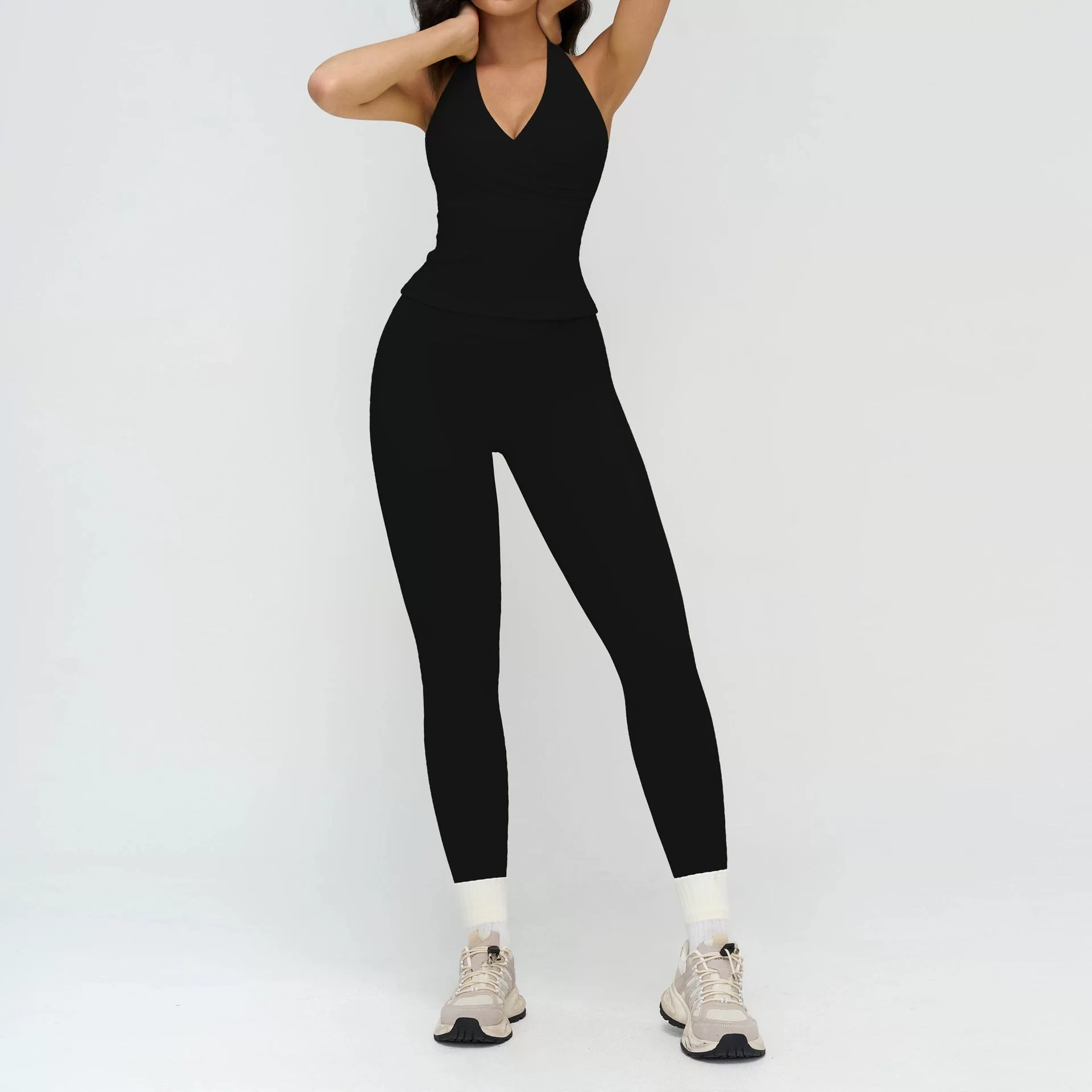 This wholesale brushed yoga set is designed for women��s cross-border activewear markets, combining warmth, performance, and a sleek, body-contouring fit. Made from soft brushed fabric, it offers a cozy, skin-friendly feel with excellent stretch for comfortable movement. The hollow open-back design adds breathability while creating a modern, stylish athletic look.