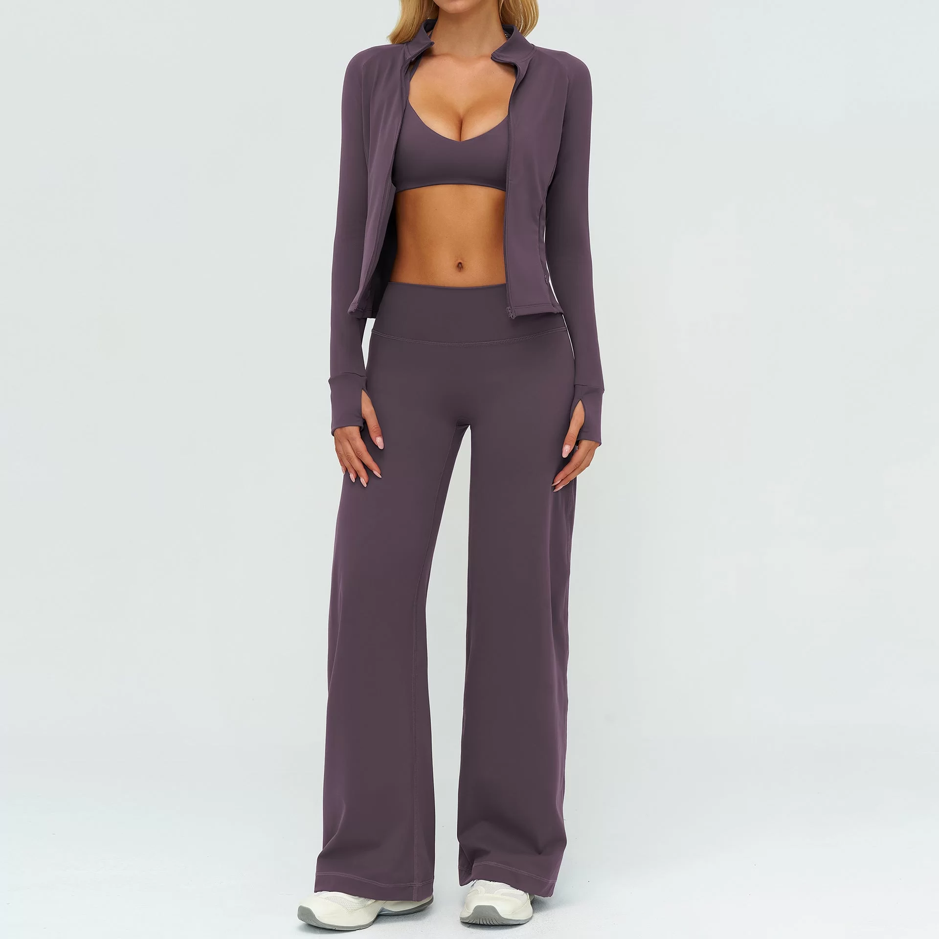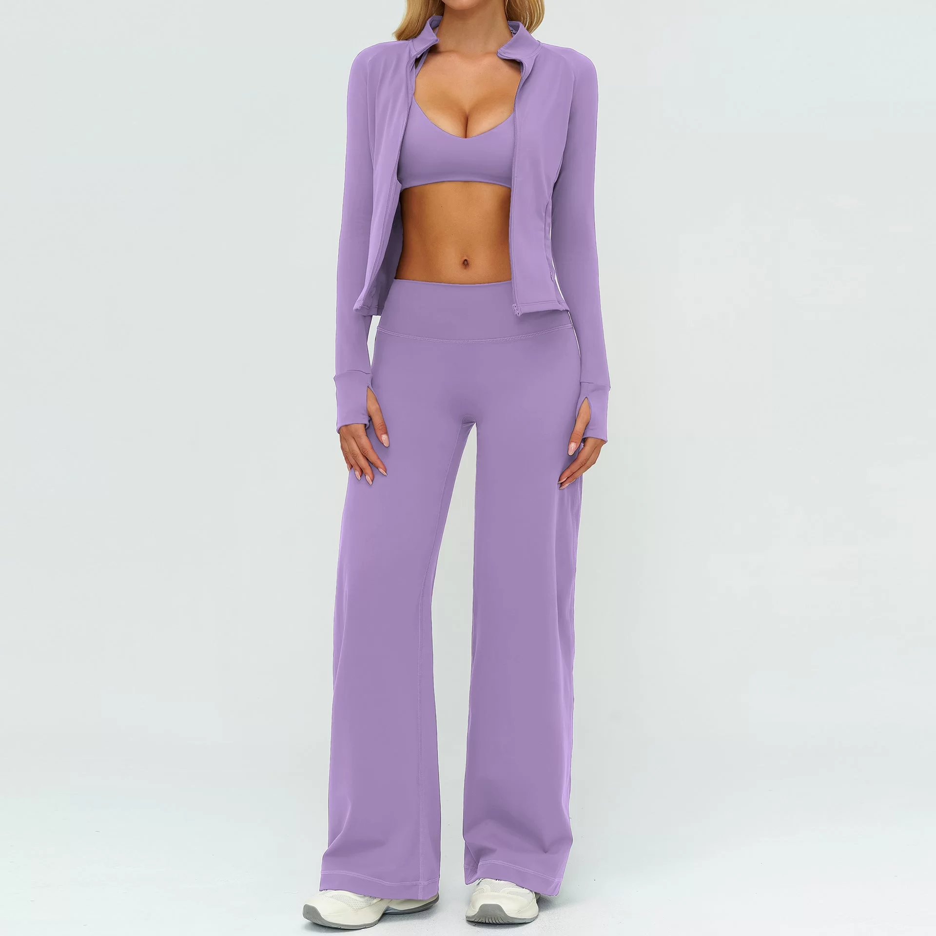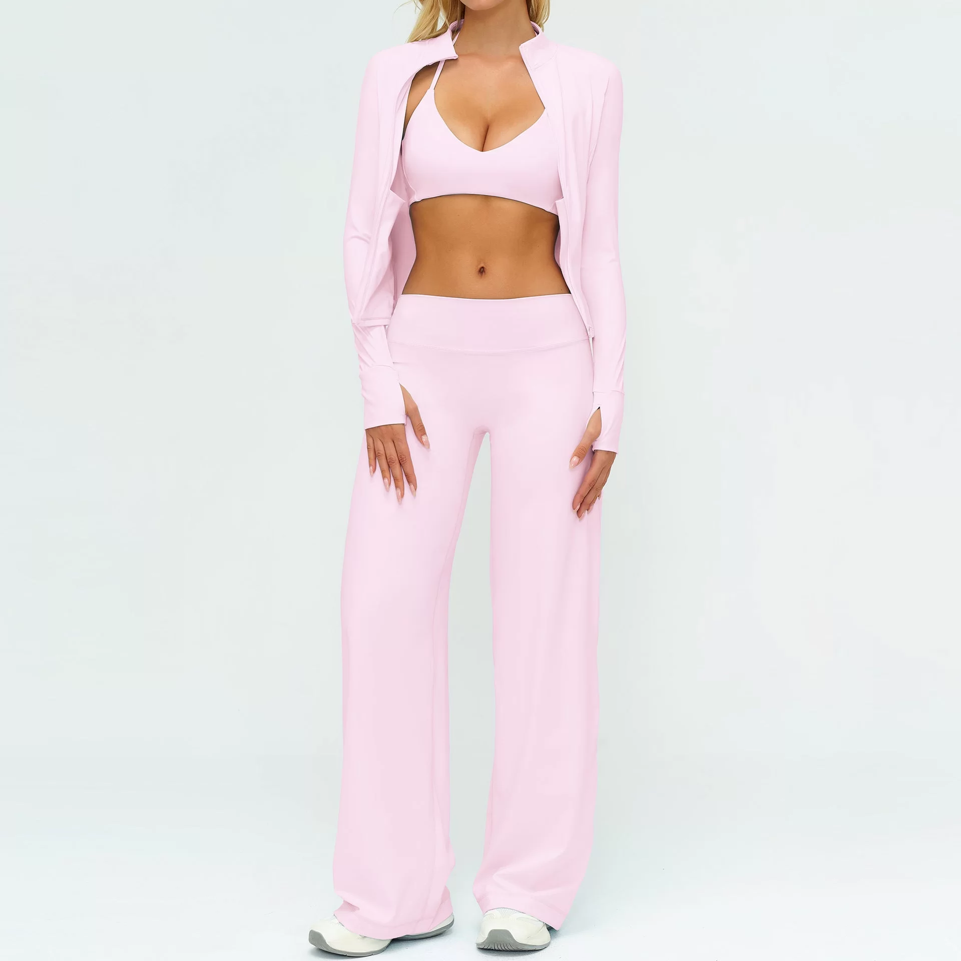 Perfect for outdoor sports, yoga practice, fitness training, running, and everyday casual wear, this women??s three-piece set provides versatility and easy layering. Its fashionable yet functional design makes it ideal for wholesale supply, bulk orders, and private label activewear brands targeting lifestyle and fitness collections.