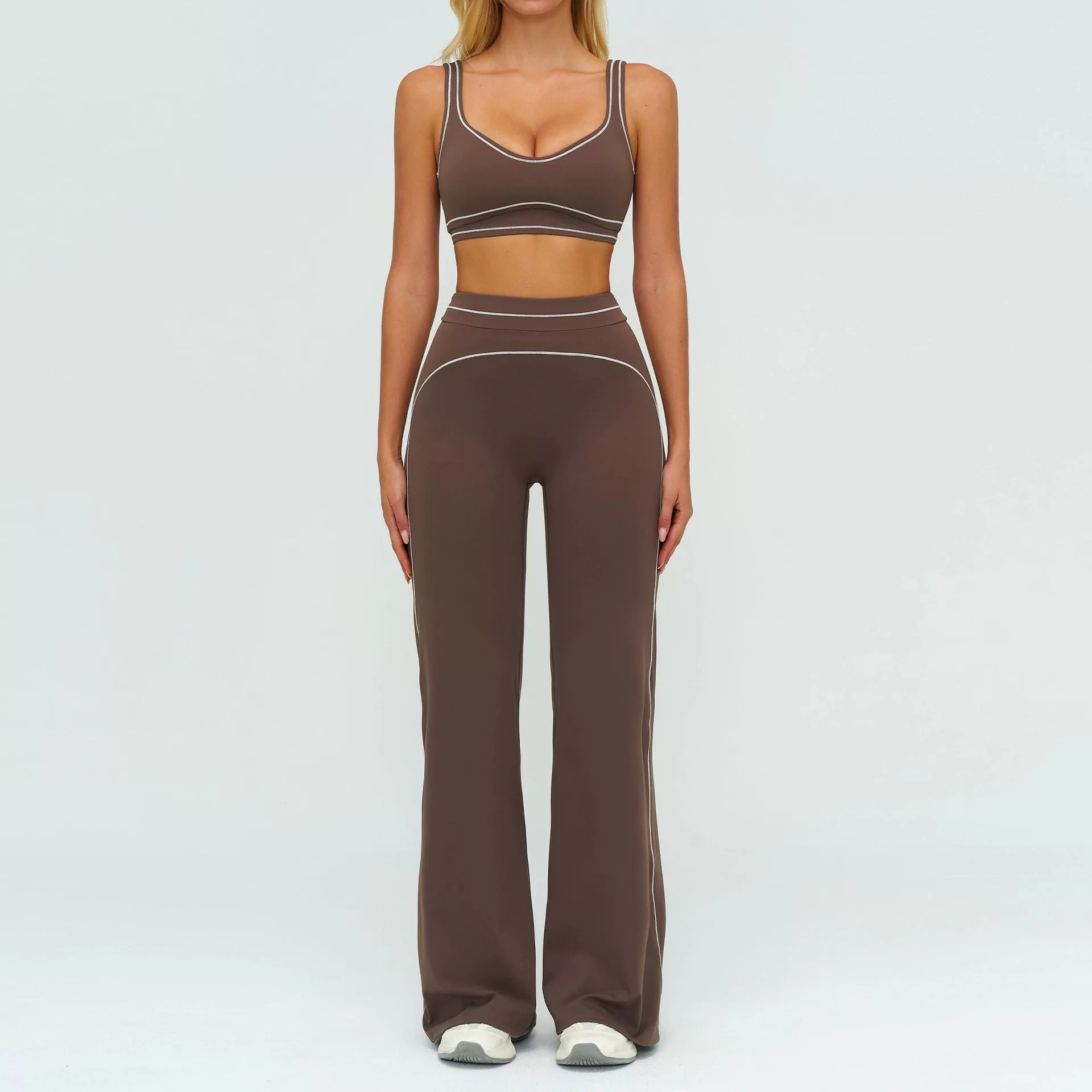 This wholesale contrast yoga set features a premium brushed finish and a modern color-block design, created for stylish women??s activewear in cross-border markets. Made from soft brushed fabric, it offers warmth, stretch, and a smooth skin-friendly feel for all-day comfort. The double-strap sports bra provides stable support while enhancing a clean, high-end athletic look.