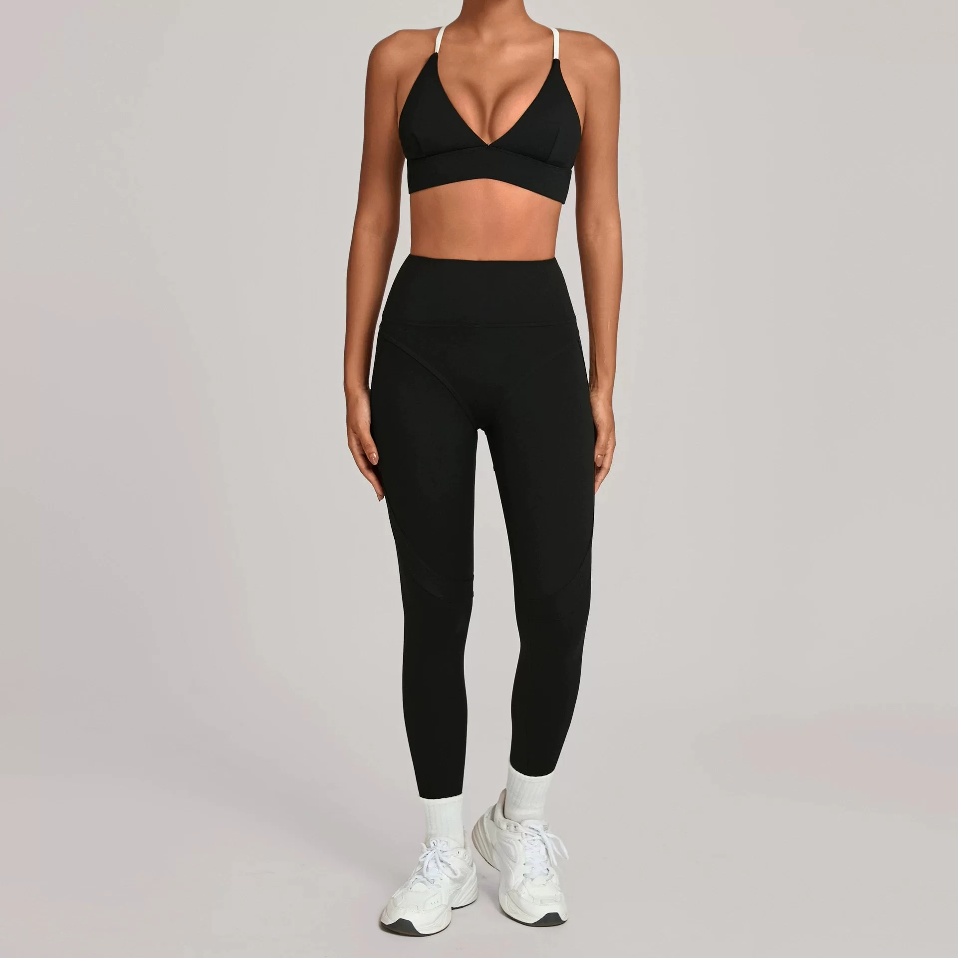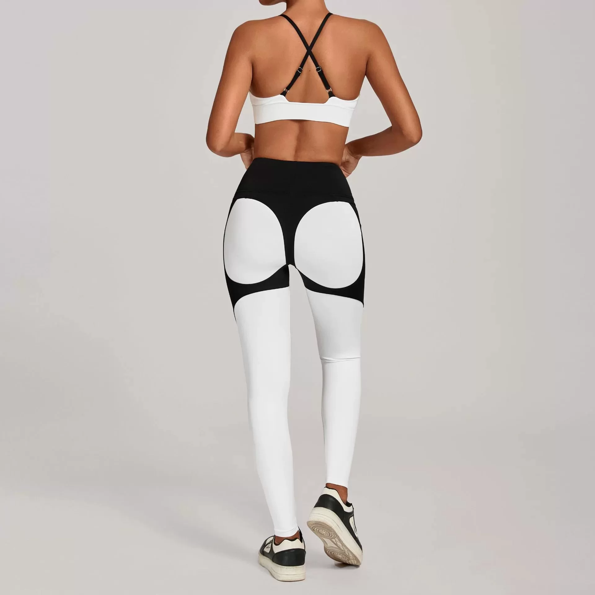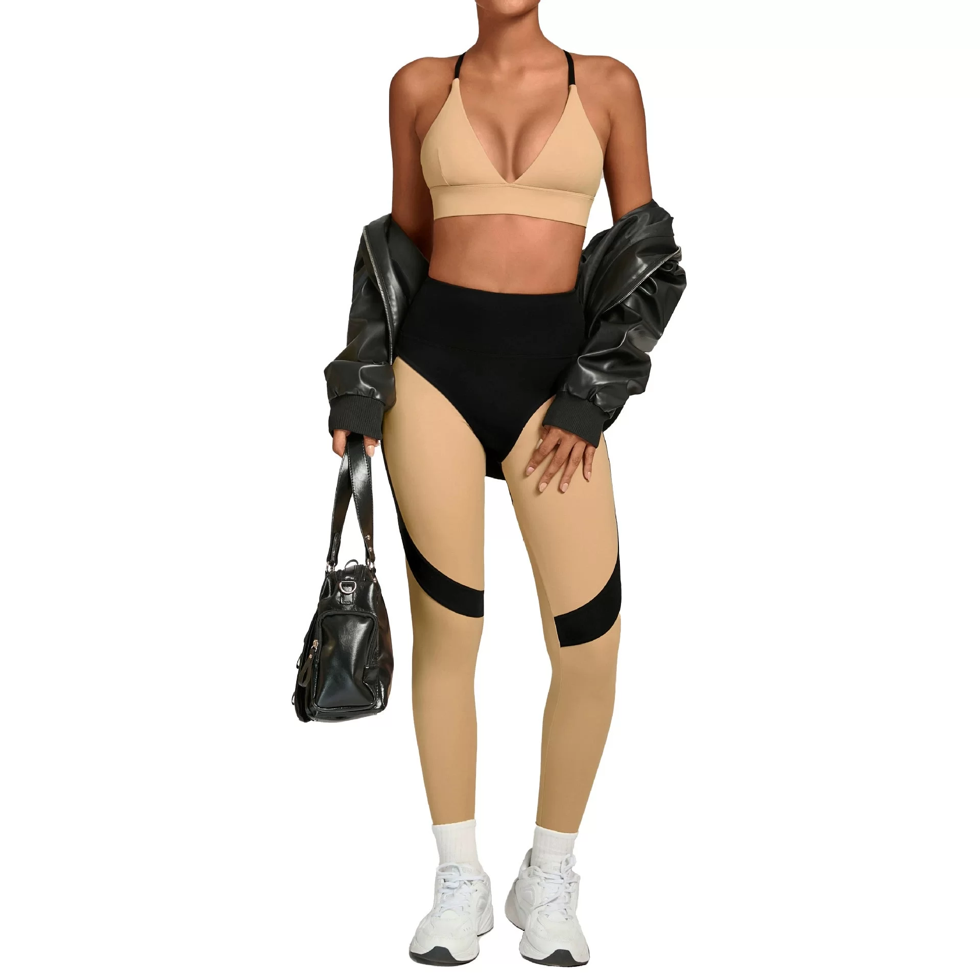 This wholesale contrast yoga set is a new arrival designed for modern women??s activewear and cross-border markets. Featuring a stylish color-block design, this two-piece set delivers a bold, athletic look while maintaining a sleek, body-hugging fit. The high-waist leggings provide excellent core support and a flattering, slimming silhouette.
