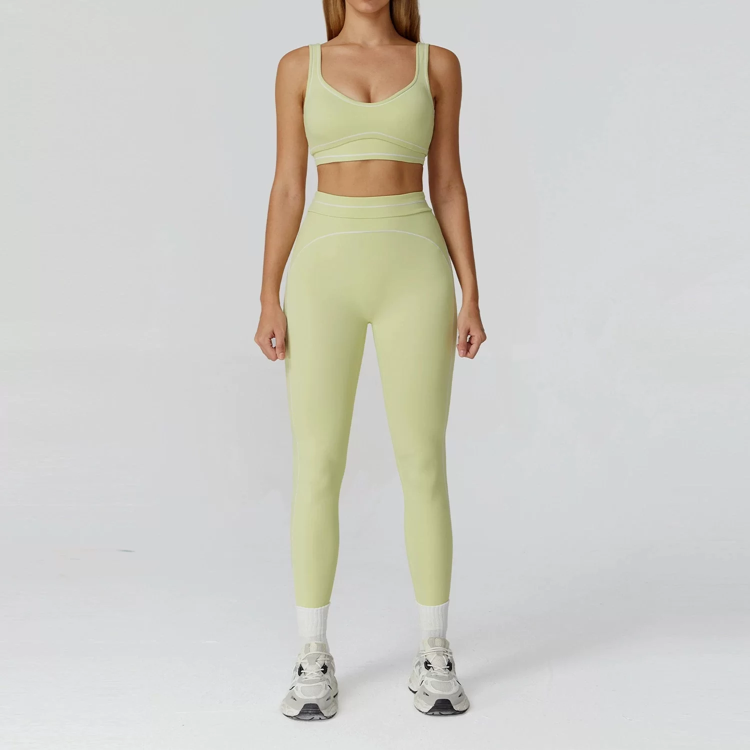 This wholesale contrast yoga set features a premium brushed finish and a modern color-block design, created for stylish women??s activewear in cross-border markets. Made from soft brushed fabric, it offers warmth, stretch, and a smooth skin-friendly feel for all-day comfort. The double-strap sports bra provides stable support while enhancing a clean, high-end athletic look.