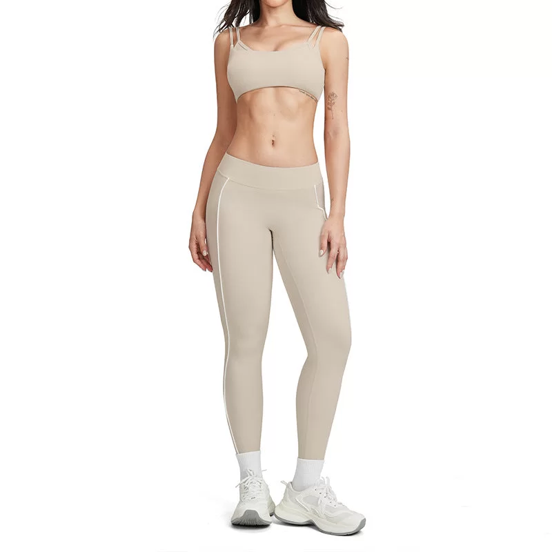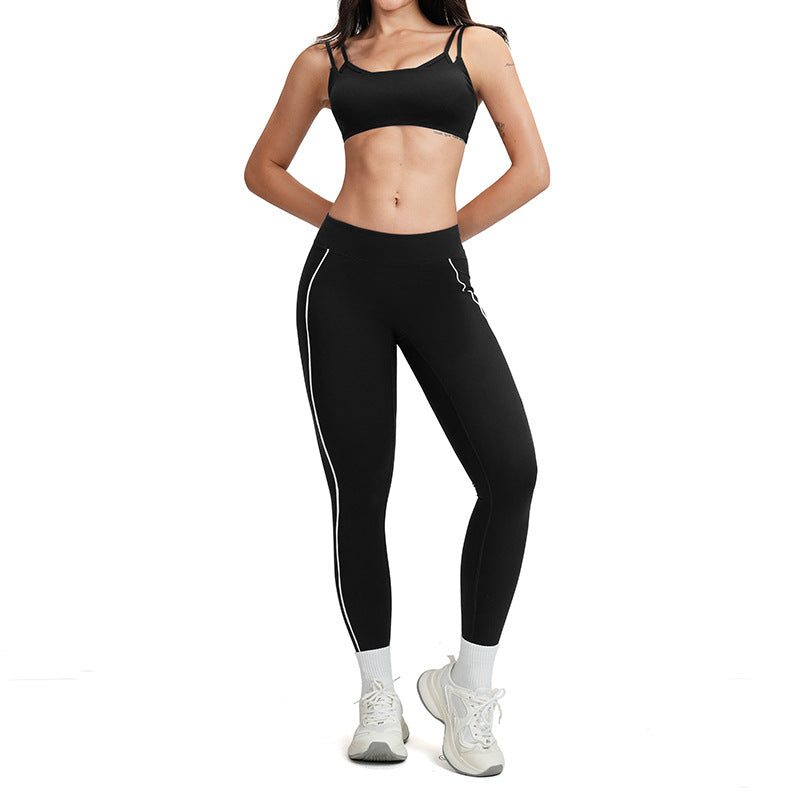 This wholesale bare feel yoga set is designed for women??s cross-border activewear markets, delivering a clean, modern look with high-performance comfort. Crafted from premium bare-feel fabric, it provides a smooth, second-skin wearing experience with excellent stretch and breathability. The white base with contrast stitching creates a three-dimensional, body-sculpting effect that enhances the silhouette.