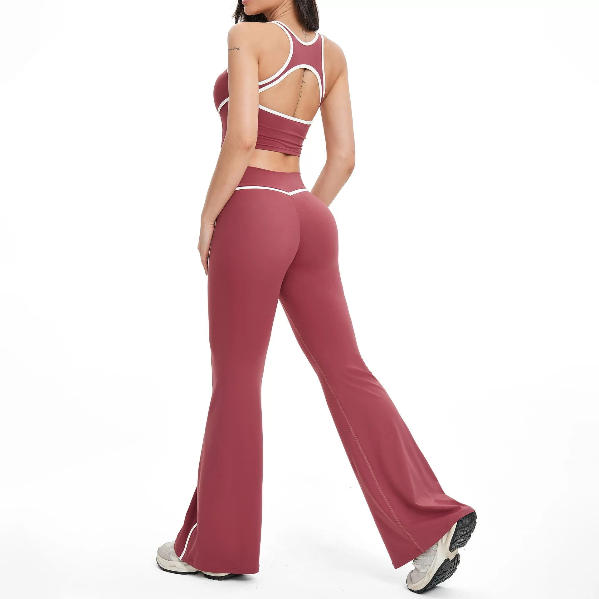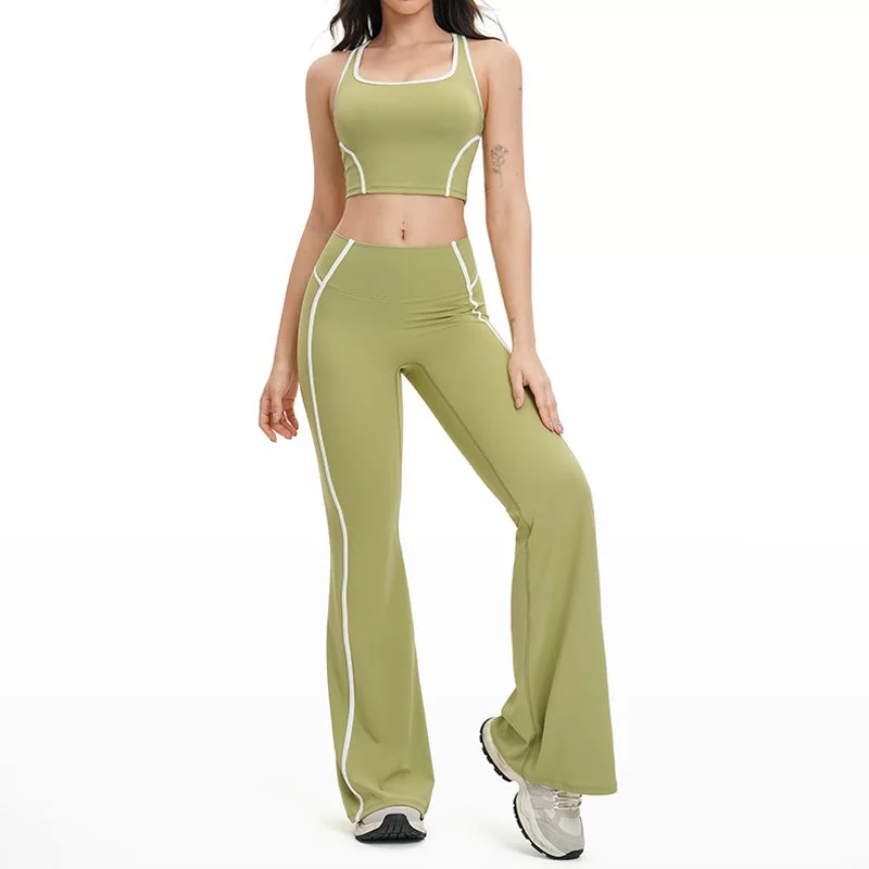 This wholesale open back yoga set is a new arrival designed for women??s cross-border activewear markets, blending a sleek, modern look with high-performance comfort. Crafted from premium bare-feel fabric, it delivers a smooth, second-skin wearing experience with excellent stretch and breathability. The contrast color details combined with a hollow open-back design create a stylish, eye-catching silhouette.