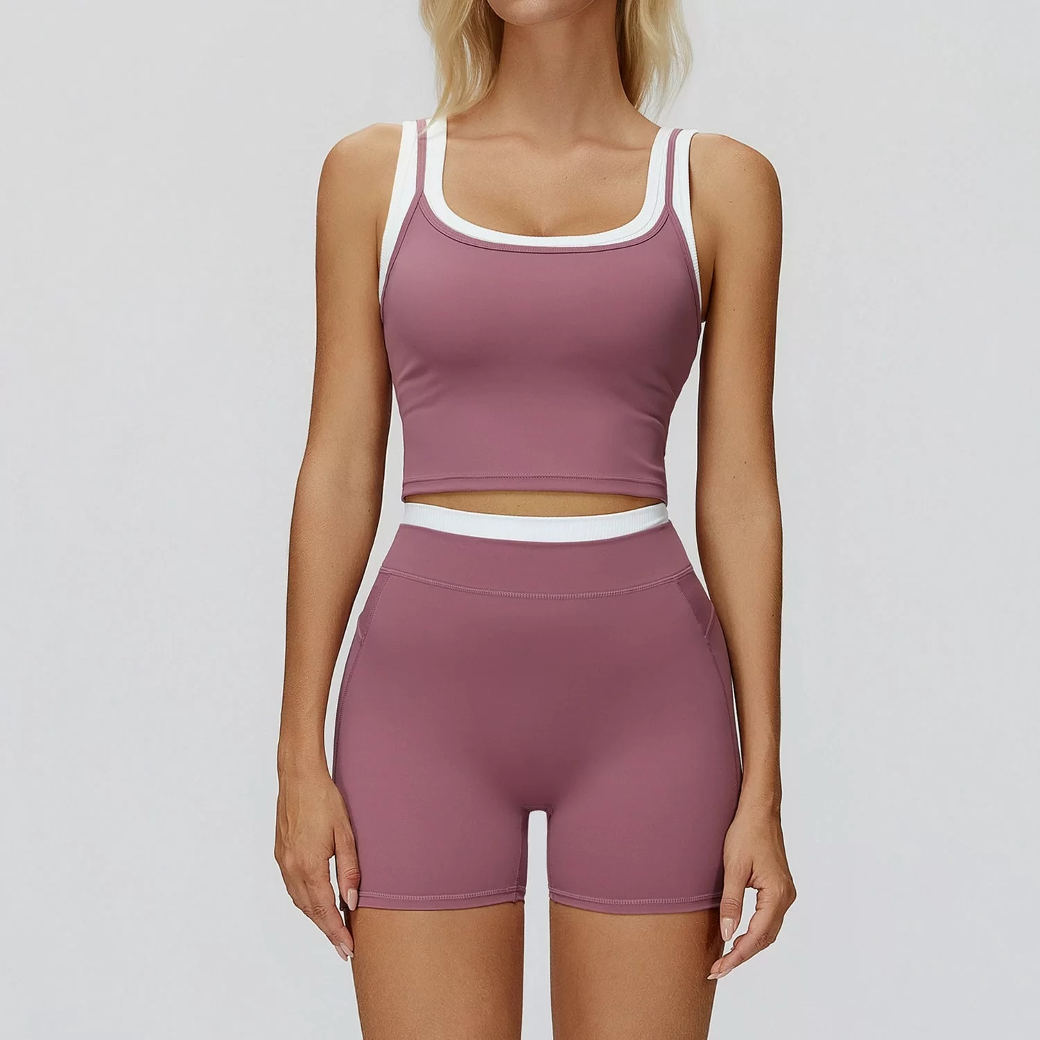 The high-waist shorts provide core support and a flattering, slimming fit, while the supportive sports bra ensures stability during movement. Perfect for outdoor activities, gym workouts, fitness training, yoga, and everyday athleisure, this set offers versatility and modern appeal. Ideal for wholesale supply, bulk orders, and private label activewear brands, this bra and shorts set is a strong choice for trend-focused fitness collections.