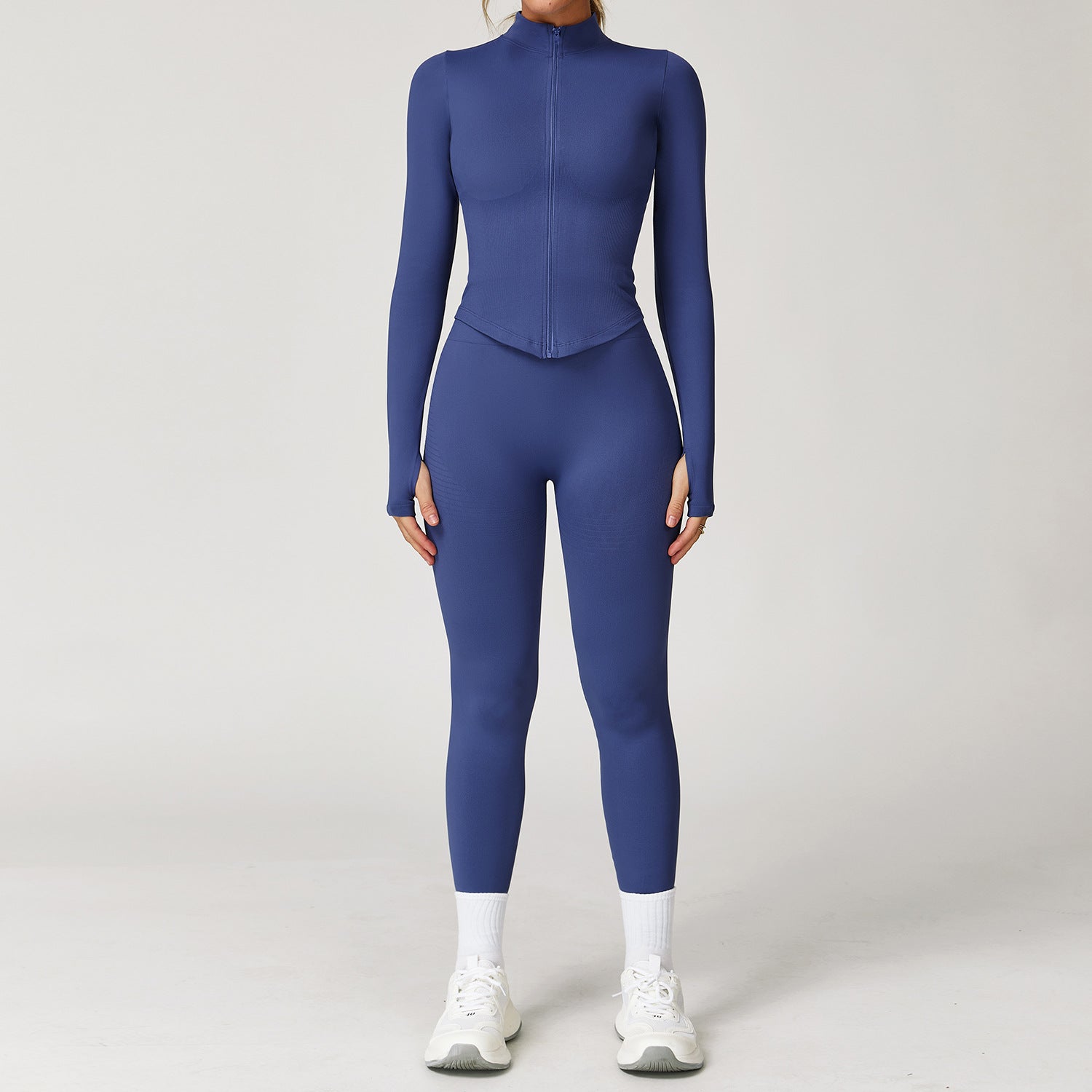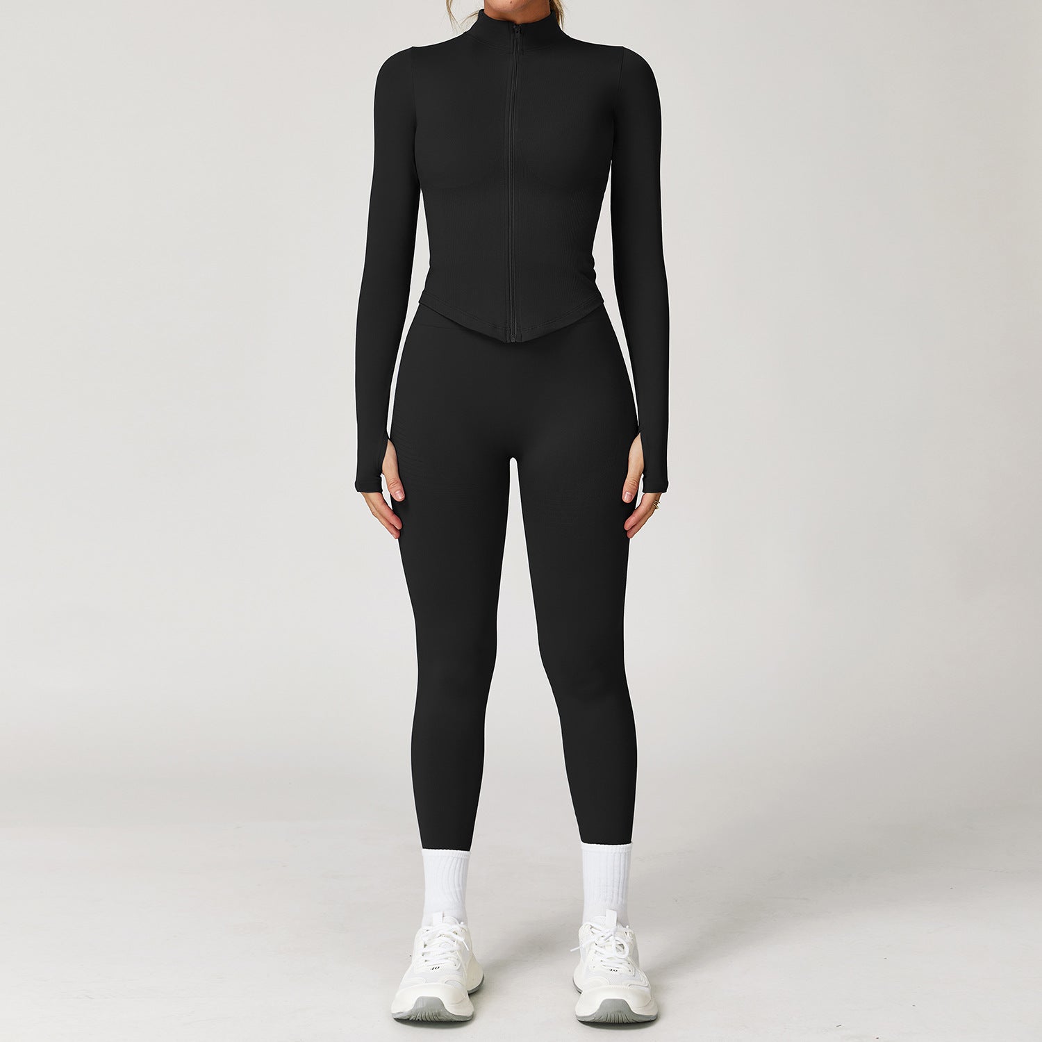 This wholesale seamless yoga set is designed for women??s activewear and cross-border markets, combining sleek style with body-sculpting performance. Made with seamless ribbed fabric, it delivers a smooth, comfortable feel with high elasticity and breathability. The racerback (I-back) design highlights the back while providing stable support during movement.