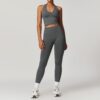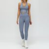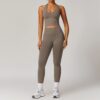 This wholesale seamless yoga set is designed for women??s activewear and cross-border markets, combining sleek style with body-sculpting performance. Made with seamless ribbed fabric, it delivers a smooth, comfortable feel with high elasticity and breathability. The racerback (I-back) design highlights the back while providing stable support during movement.