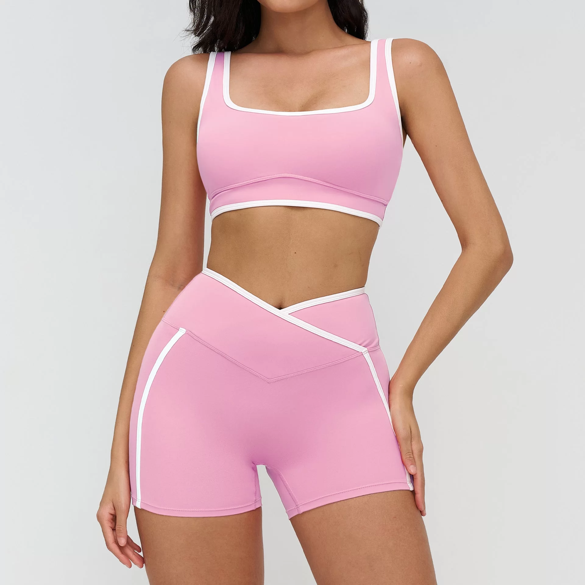 This wholesale bare feel yoga set is designed for women??s cross-border activewear markets, blending a sleek, tight-fit silhouette with modern contrast styling. Crafted from premium bare-feel fabric, it delivers a smooth, second-skin wearing experience with excellent stretch and breathability. The contrast color design adds a fashionable, sporty edge while maintaining a clean, athletic look.