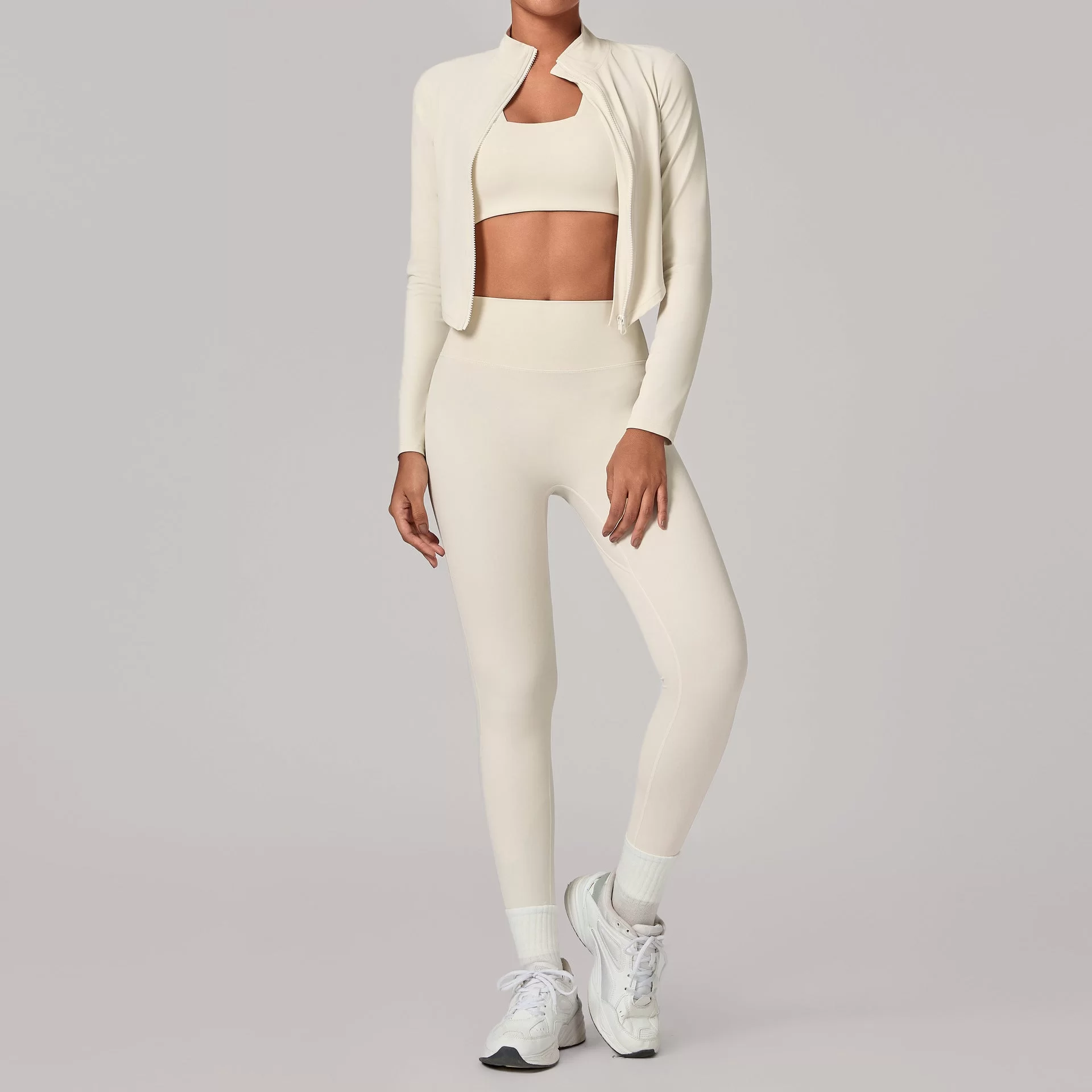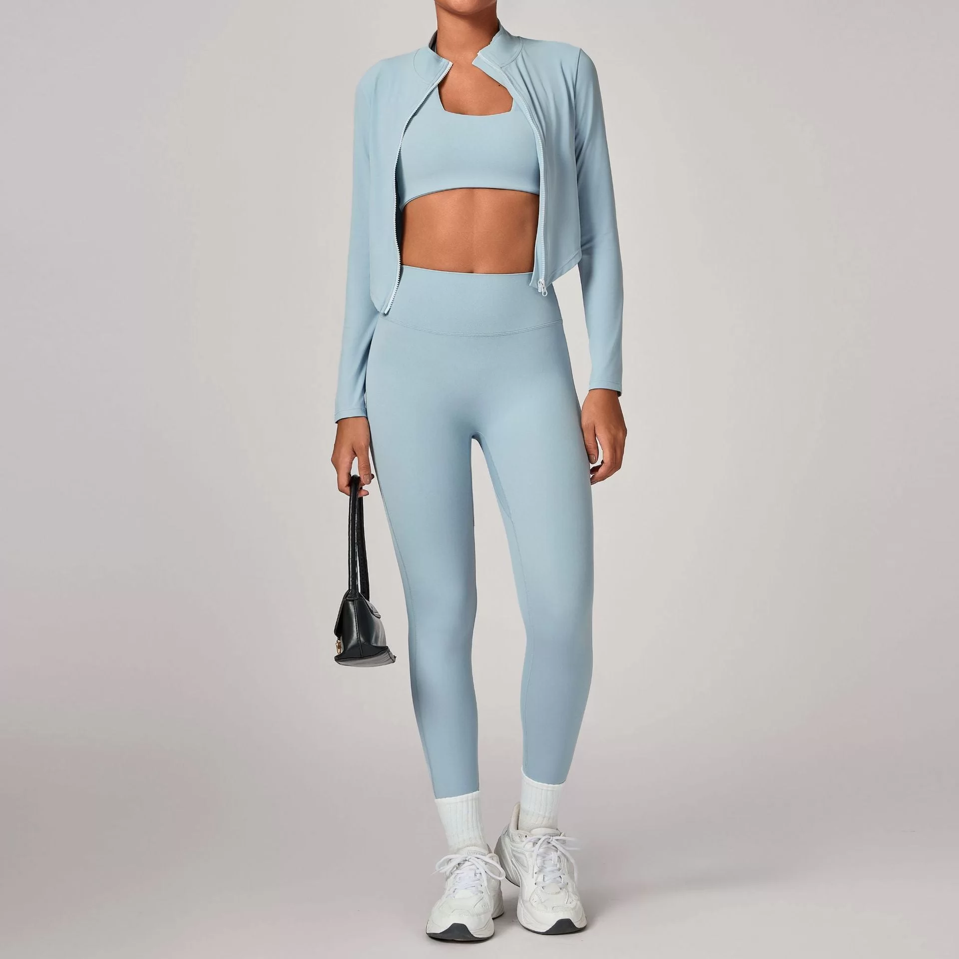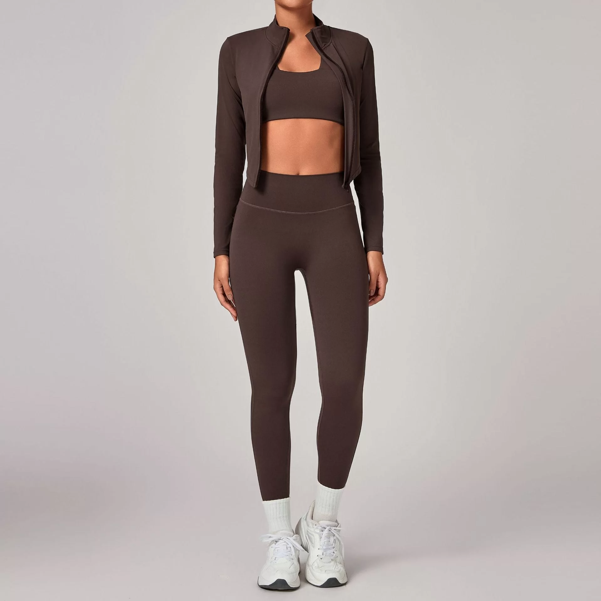 This wholesale zip collar yoga set is a premium three-piece activewear set designed for cross-border autumn and winter markets. Featuring a stand-up collar with full zipper, it offers wind protection and adjustable warmth while maintaining a sleek, slim-fit silhouette. The fitted jacket, bra, and leggings create a complete, versatile outfit for layered training and outdoor wear.