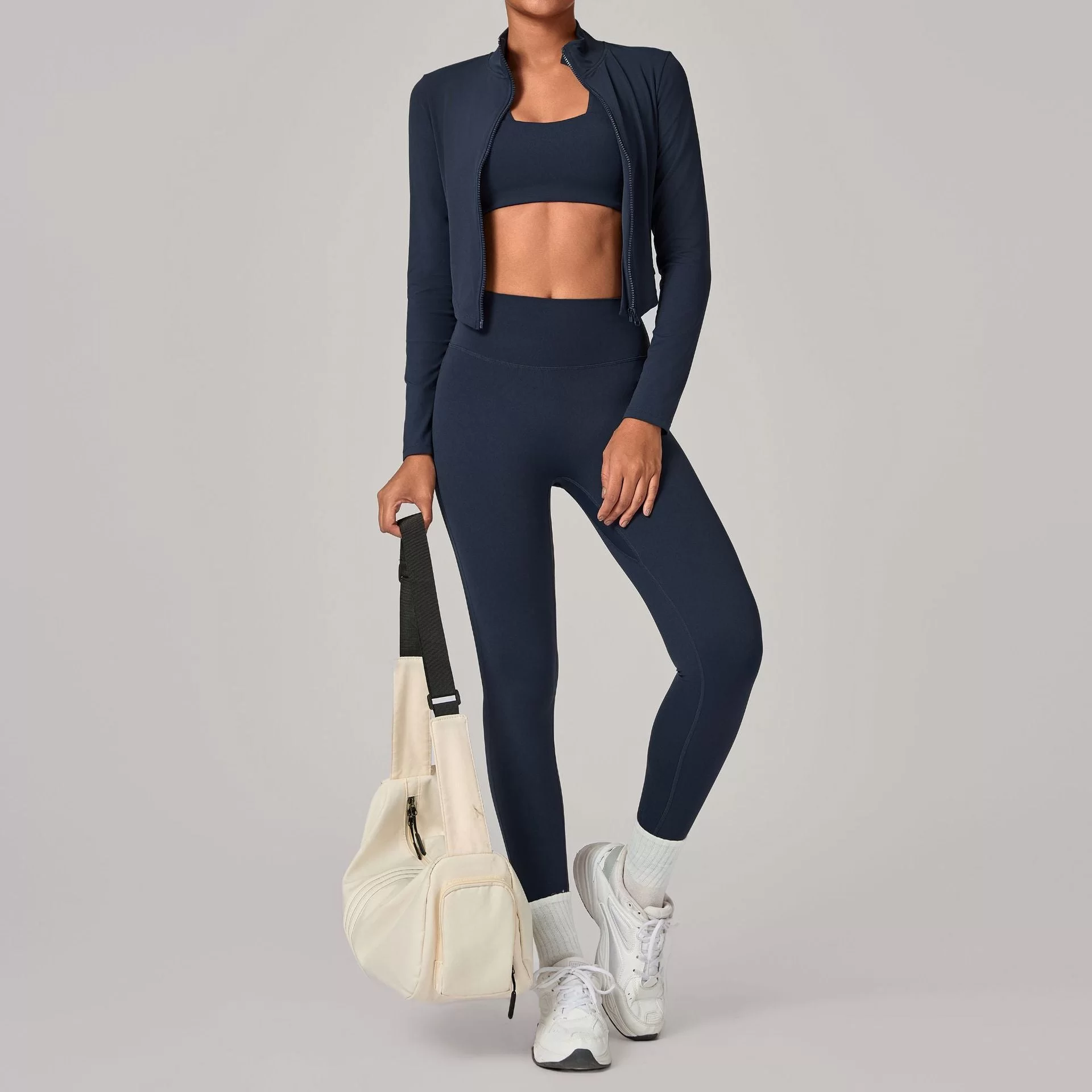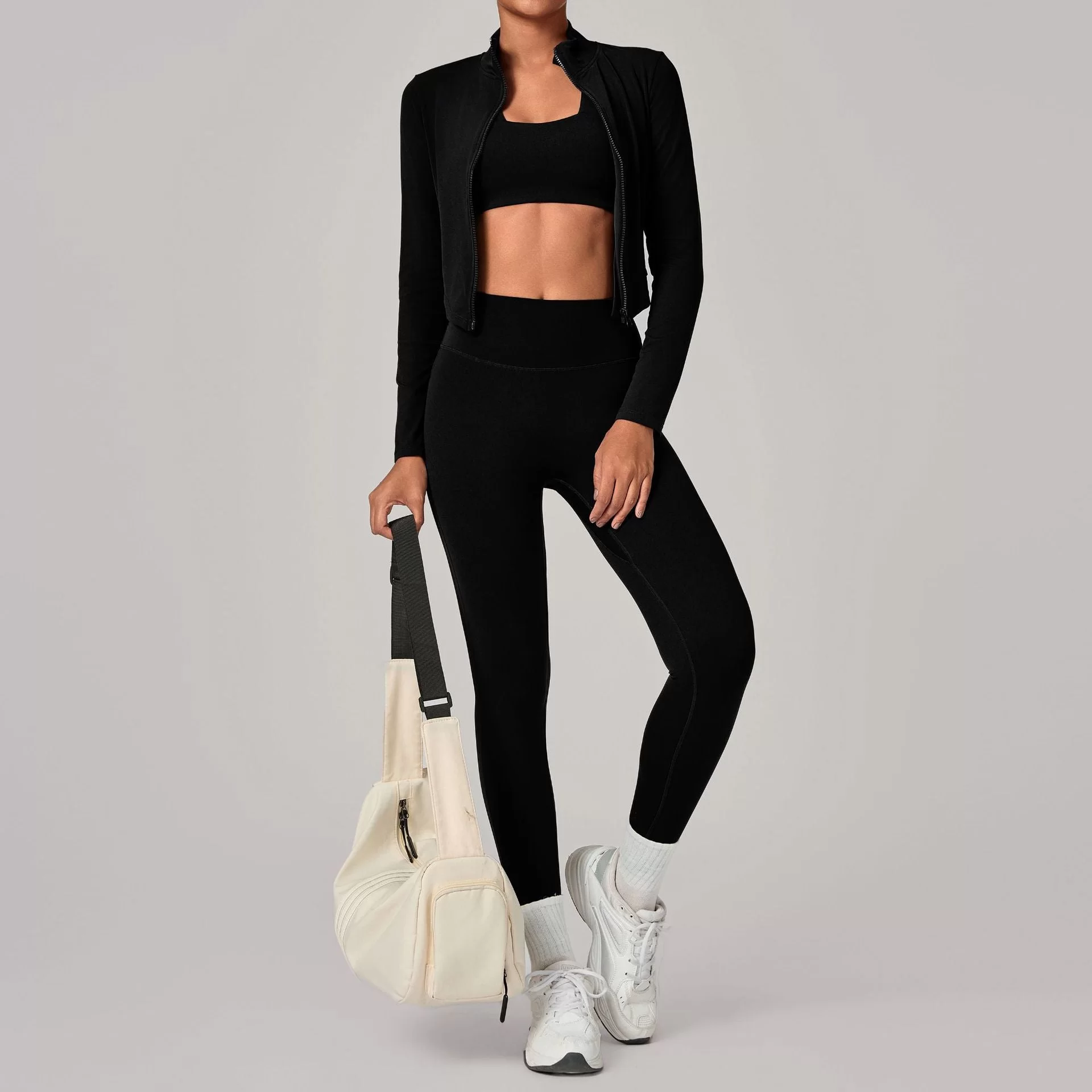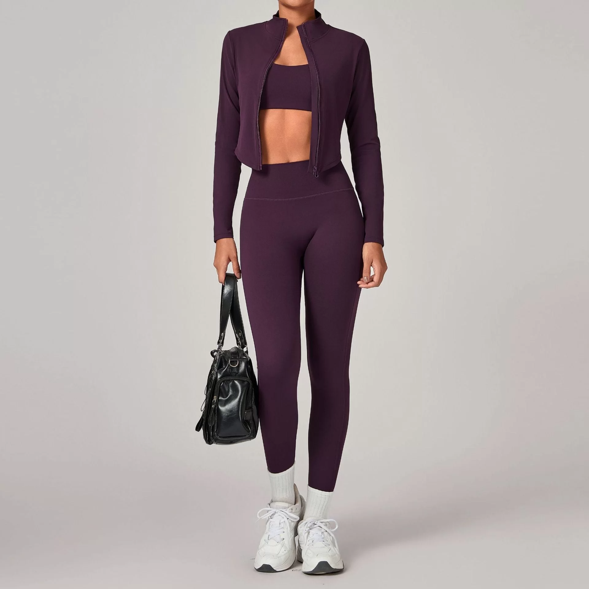 This wholesale zip collar yoga set is a premium three-piece activewear set designed for cross-border autumn and winter markets. Featuring a stand-up collar with full zipper, it offers wind protection and adjustable warmth while maintaining a sleek, slim-fit silhouette. The fitted jacket, bra, and leggings create a complete, versatile outfit for layered training and outdoor wear.